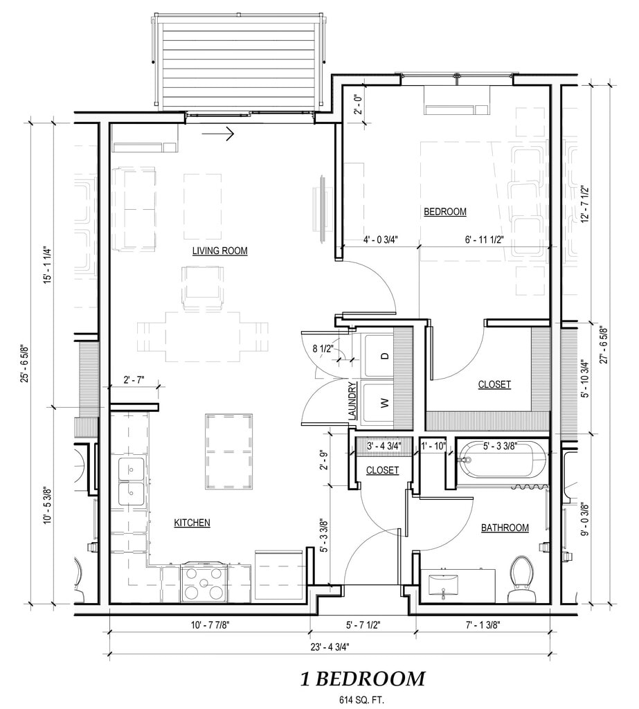 1 Bed, 1 Bath, 614 sq ftPlus FeesAvailable NowModel Gallery