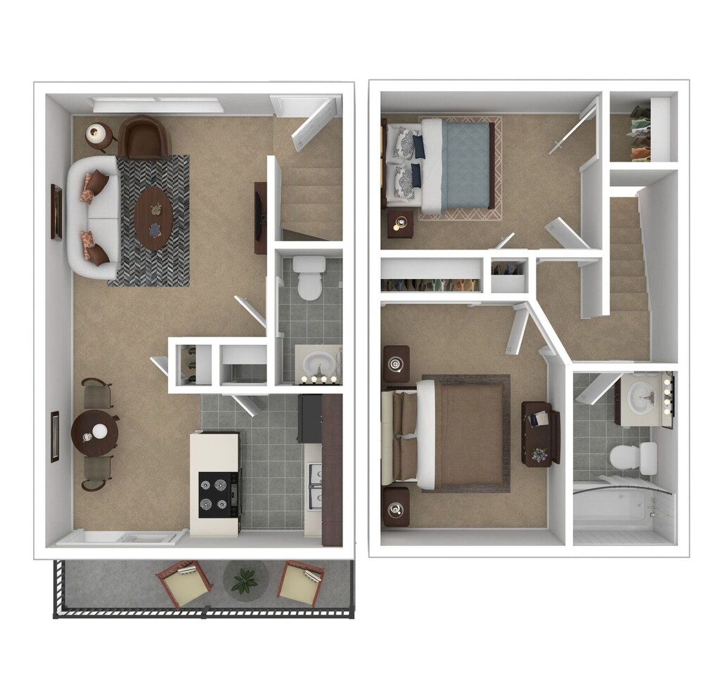 2 Bedroom 1 Bath - Floorplan 2 2 Bedroom,1.5 Bath Townhome