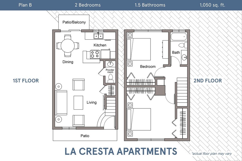 Plan B - 2 Bedroom, 1.5 Bath - Floorplan Apartment Unit: 225-107Apartment Model: Plan B - 2 Bedroom, 1.5 Bath2 Bedroom, 1.5 Bath, 1050 sq ftAvailable Now![]()