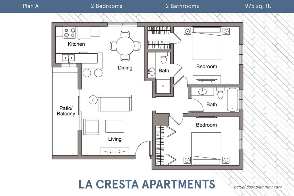 Plan A - 2 Bedroom, 2 Bath - Floorplan Apartment Unit: 223-105Apartment Model: Plan A - 2 Bedroom, 2 Bath2 Bedroom, 2 Bath, 975 sq ftAvailable Now![]()