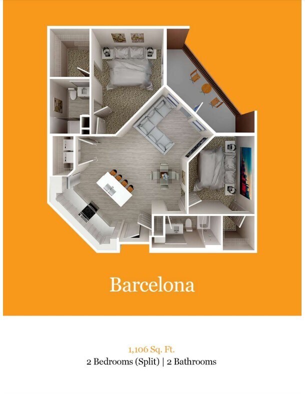 Availability Date Unit Sq Ft Unavailable Barcelona from 1106 sq ft Apartment Model: Barcelona2 Bedroom, 2 Bath, from 1106 sq ftUnavailable![]()