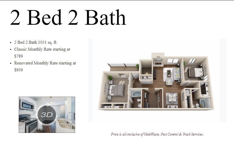 Apartment Model: 2 BedroomFrom $8752 Bedroom, 2 Bath, 1051 sq ftAvailable Now![]()