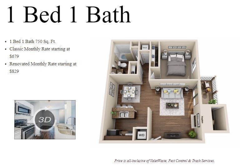 Apartment Model: 1 BedroomFrom $7951 Bedroom, 1 Bath, 750 sq ftAvailable Now![]()