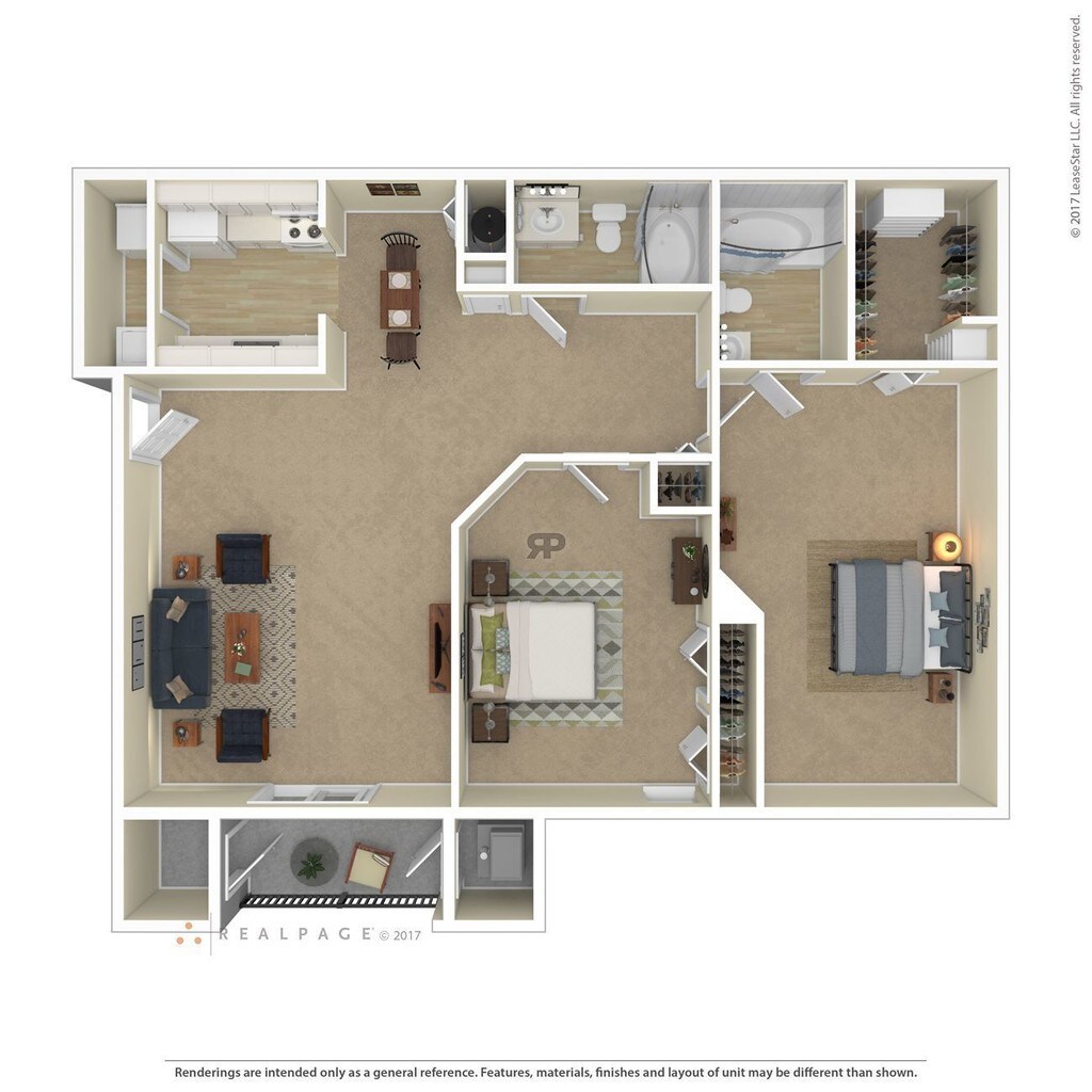 August 12, 2015I rent a 2 bedroom, 2 full bath. The master bedroom is huge and has a big walk in closet. Also has washer/dryer in the apartment which is nice. Clubhouse has, pool, workout room, etc. very nice and easy to work with here.Review from Apartments.com