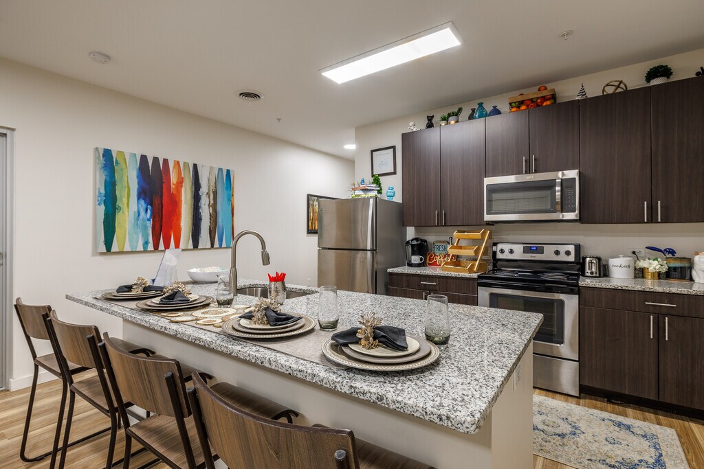 - Modern kitchens with refrigerator, range, microwave, dishwasher, and disposal
