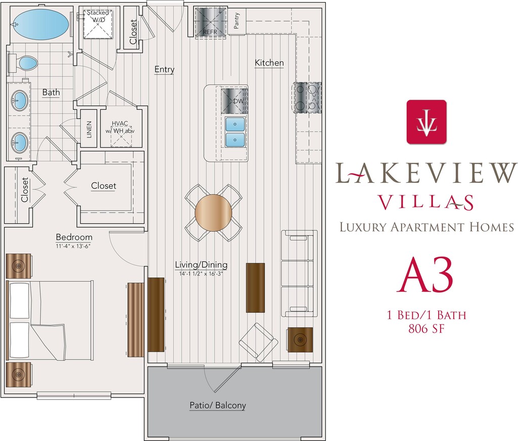 Apartment Model: A3From $1,0491 Bedroom, 1 Bath, 806 sq ftAvailable NowFloor plans are artist's rendering. All dimensions are approximate. Actual product and specifications may vary in dimension or detail. Not all features are available in every rental home. Prices and availability are subject to change. Base rent is based on monthly frequency. Additional fees may apply, such as but not limited to package delivery, trash, water, amenities, etc. Deposits vary. Please see a representative for details.