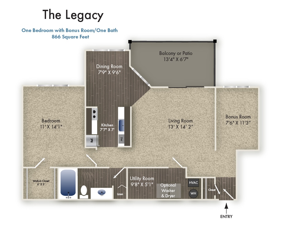 Apartment Model: Legacy1 Bedroom, 1 Bath, 866 sq ftUnavailableLegacy - Floorplan 1 2 Bedrooms