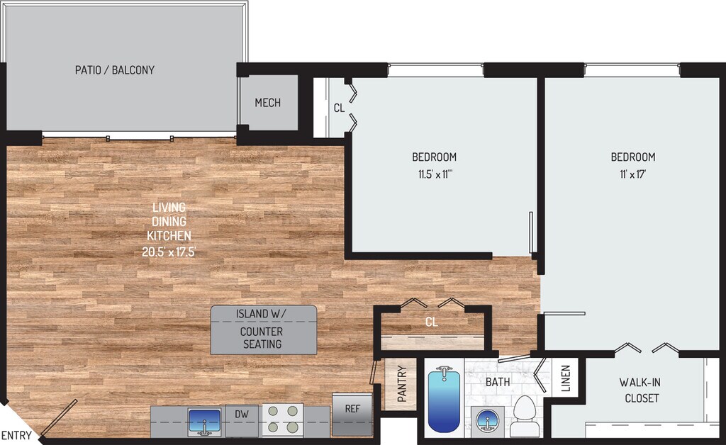 1BR + 1BA Renovated Open Concept - Floorplan 1 2 Bedrooms