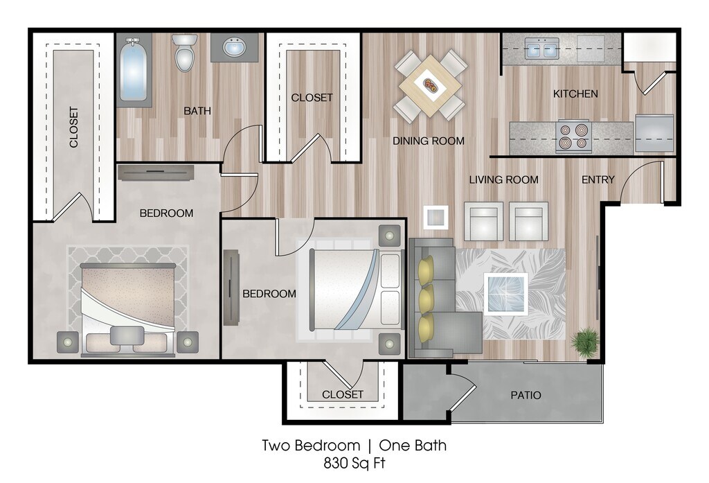 2 Beds, 1 Bath, 830 sq ftAvailable NowModel Gallery