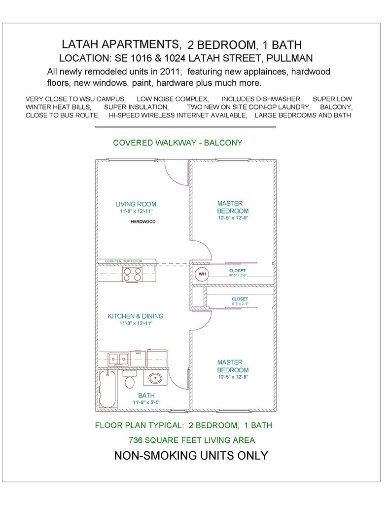 The community at Latah Apartments is situated across Washington State University and centrally located near grocery stores, restaurants, and more. Approximately 736 sf. in size, the 2-bedroom, 1-bathroom units are being upgraded in between renters with stainless steel appliances, hard surface flooring, fresh paint, new cabinets, and hardware. Enjoy either of the two coin-operated laundry facilities and plenty of off-street parking. Convenient on-site storage units are also available to rent for an additional cost depending on size.