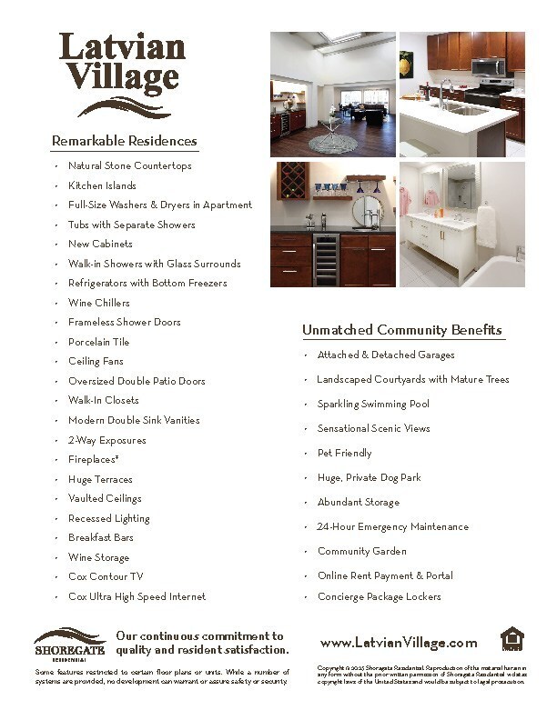 The current rent special at Latvian Village Apartments is: LIMITED TIME SPECIAL! Move-in by December 1st, and receive 1 month FREE rent! Contact the Leasing Office for details. Some restrictions apply..