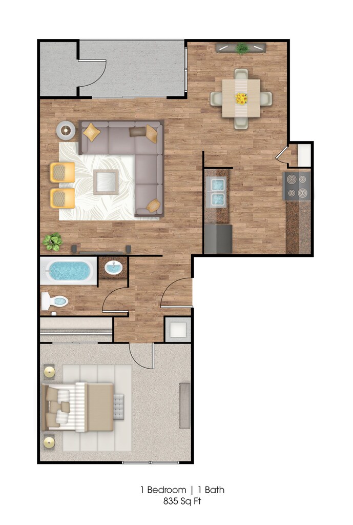 Apartment Model: 1 Bed - 1 BathFrom $9991 Bedroom, 1 Bath, 835 sq ftUnavailable1 Bed - 1 Bath - Floorplan 1 1 Bed - 1 Bath