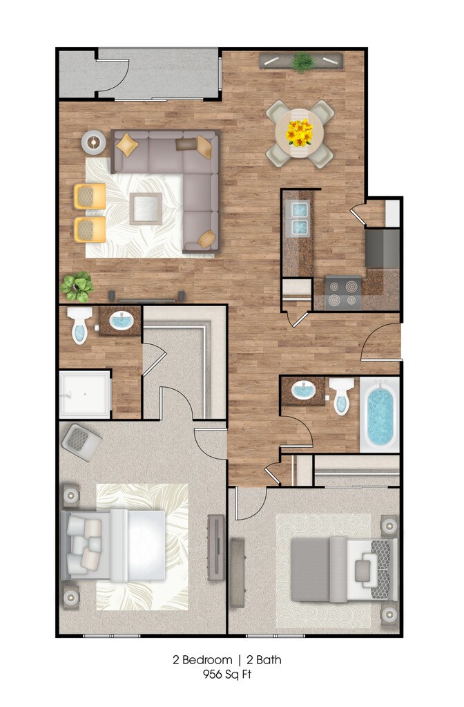Apartment Model: 2 Bed - 2 BathFrom $1,0992 Bedroom, 2 Bath, 956 sq ftAvailable Now2 Bed - 2 Bath - Floorplan 1 2 Bed - 2 Bath