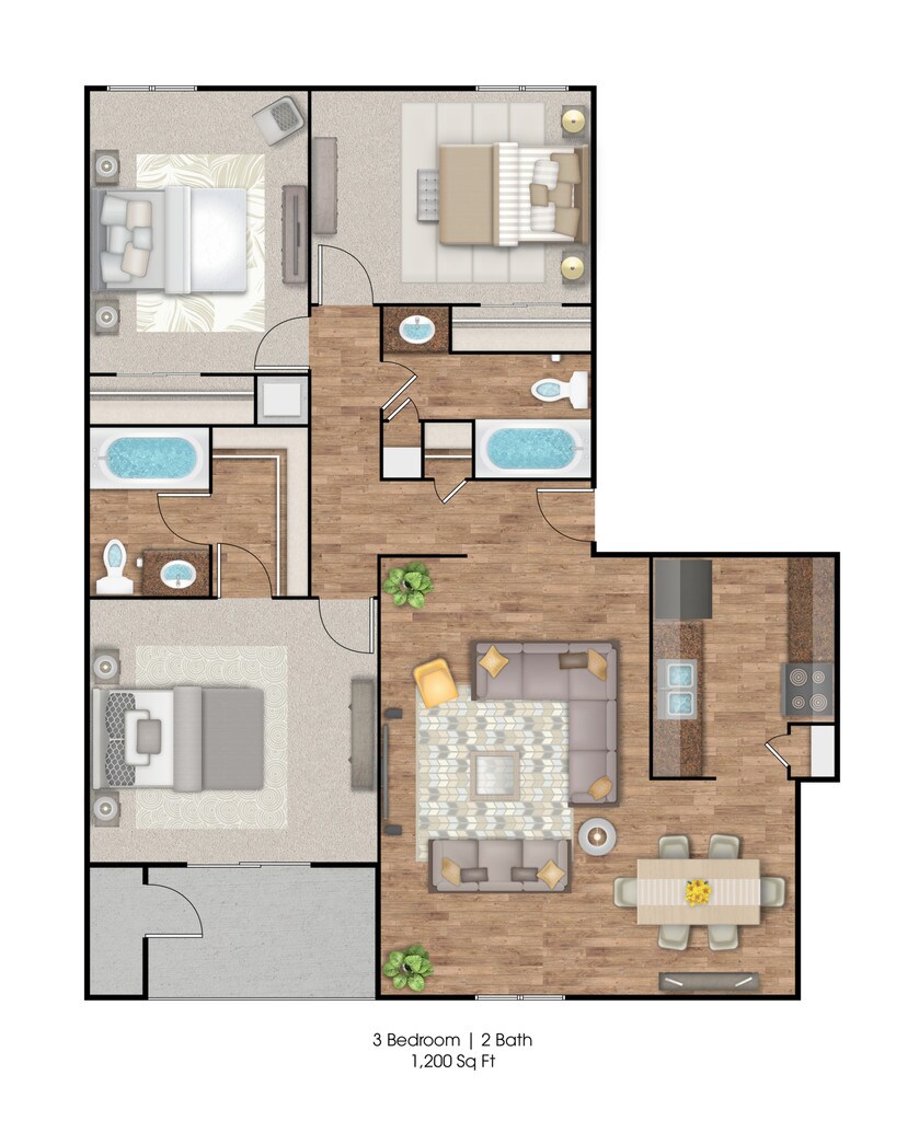 Apartment Model: 3 Bed - 2 BathFrom $1,6203 Bedroom, 2 Bath, 1200 sq ftUnavailable3 Bed - 2 Bath - Floorplan 1