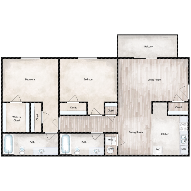 2 Beds, 1.5 Baths, 1152 sq ftLargest 2 BedroomThis is the largest 2 Bedroom at this PropertyModel Gallery