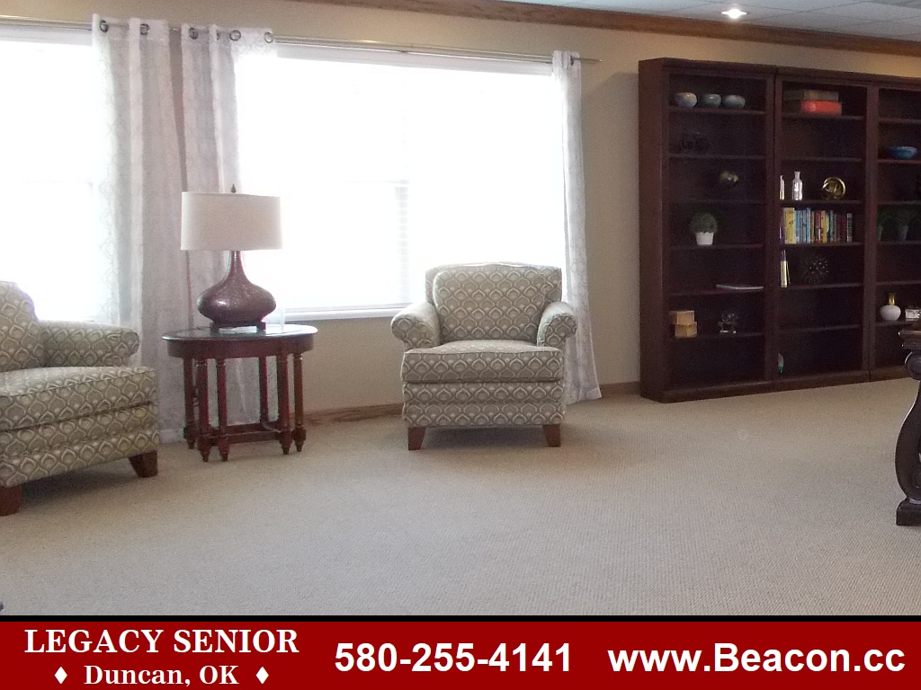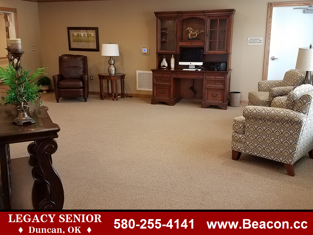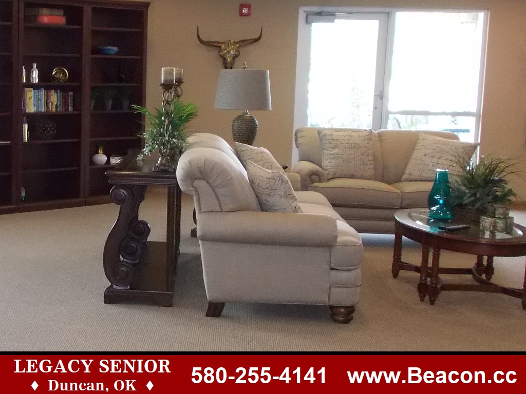 The Legacy Senior Residences of Duncan; our community provides housing for seniors who earn less than 60% of the area median income. The Legacy is an independent living community for adults 62+ designed with accessibility and ease of use for its residents. The Legacy features one and two bedroom apartments with fully equipped kitchens, full size washer/dryer provided in each apartment! Free utilities are included, with the exception of phone, cable and internet. The building includes elevators, wide hallways for easy access, handrails in the common areas and in all bathrooms, controlled access entry with intercom, individual apartment security systems, and a storm shelter. There are many common areas where residents can visit and enjoy the company of neighbors. For those that relish the outdoors there is a covered patio and seating area. Call us today for more information!