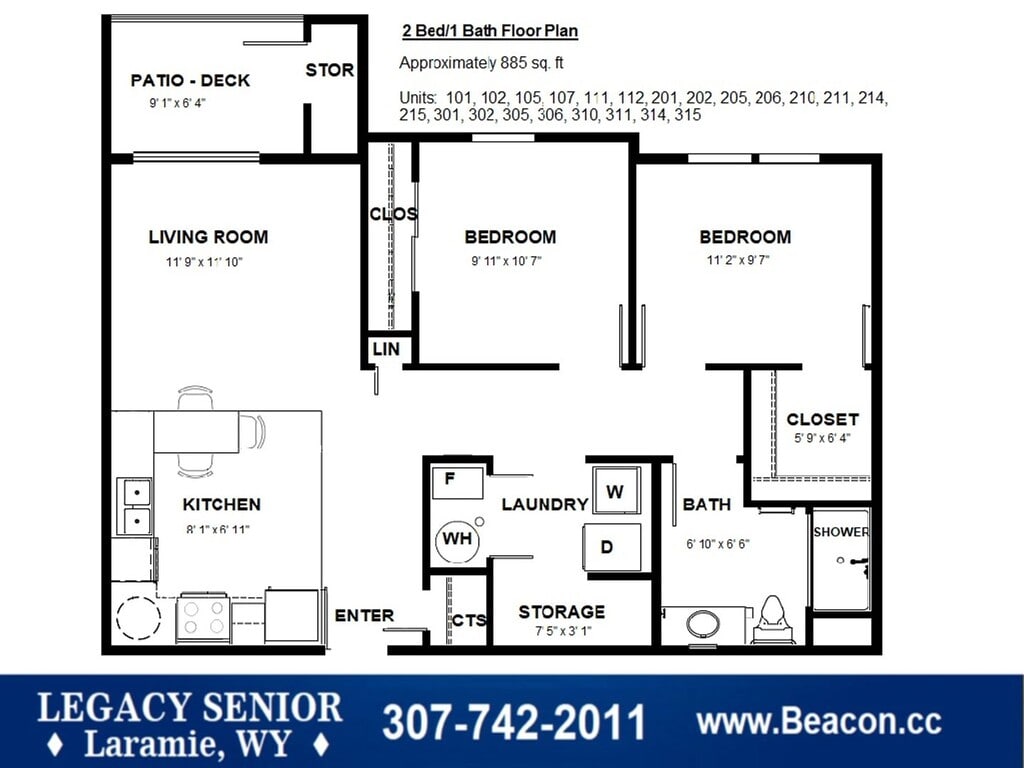 2x1 50/55% TC TypeE - Floorplan 11 Apartment Unit: 301Apartment Model: 2x1 50/55% TC TypeE2 Bedroom, 1 Bath, 885 sq ftAvailable Now2x1 30% HTF HCP TypeF