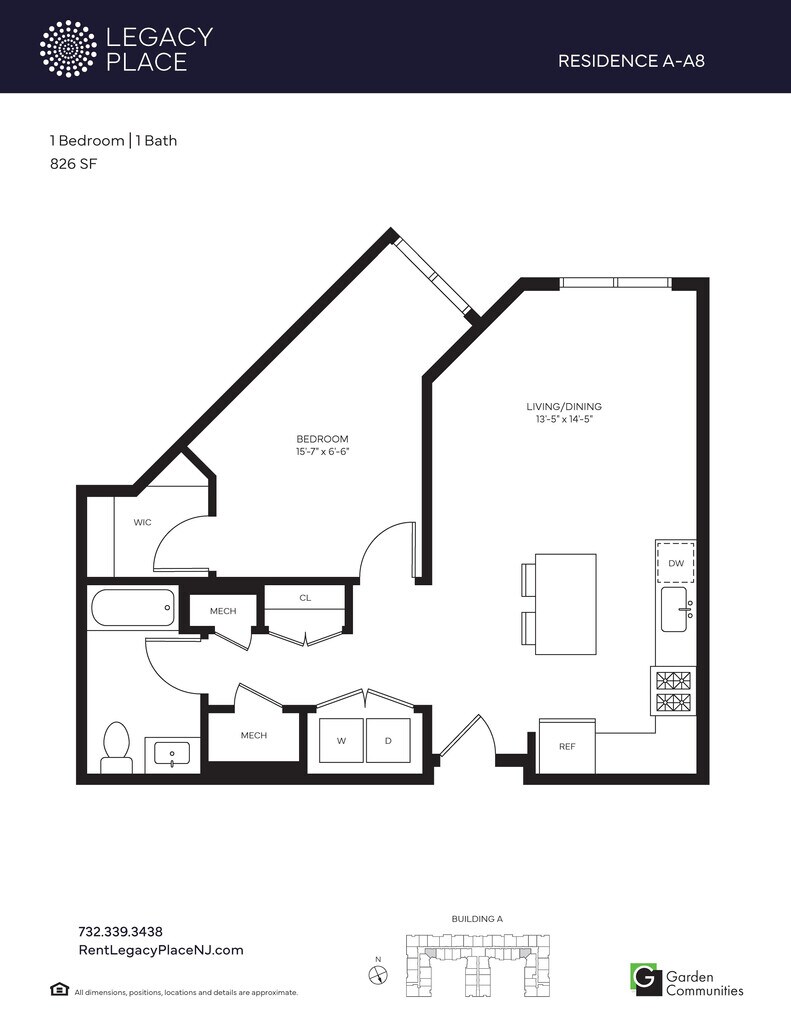 Apartment Model: $2.89/sq.ft. - Residence A-A8From $2,3901 Bedroom, 1 Bath, 826 sq ftUnavailable![]()
