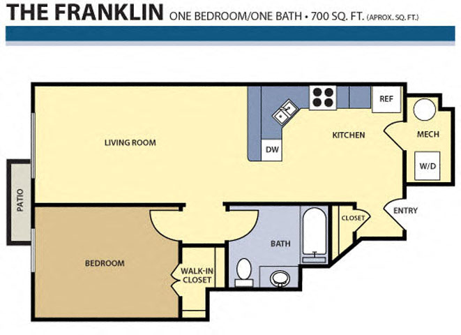 The Franklin - Floorplan 1 Apartment Unit: 80822Apartment Model: The FranklinCall For Rates1 Bedroom, 1 Bath, 700 sq ftAvailable NowThe Madison