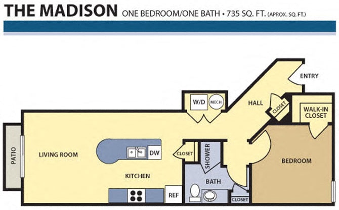 The Madison - Floorplan 1 Apartment Unit: 58613Apartment Model: The Madison$1,4821 Bedroom, 1 Bath, 735 sq ftAvailable NowApartment Unit: 76813Apartment Model: The Madison$1,4931 Bedroom, 1 Bath, 735 sq ftAvailable NowThe Madison Handicap
