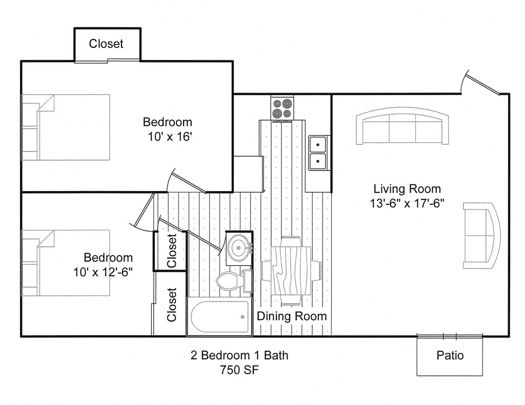 2 Beds, 1 Bath, 750 sq ftAvailable NowModel Gallery