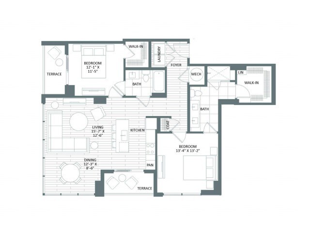 G-2 - Floorplan 1 Apartment Unit: 14GApartment Model: G-2From $2,5841 Bedroom, 1 Bath, 833 sq ftAvailable NowFloorplan D-2