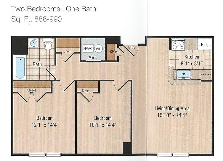 2 Beds, 1 Bath, 888-990 sq ftModel Gallery