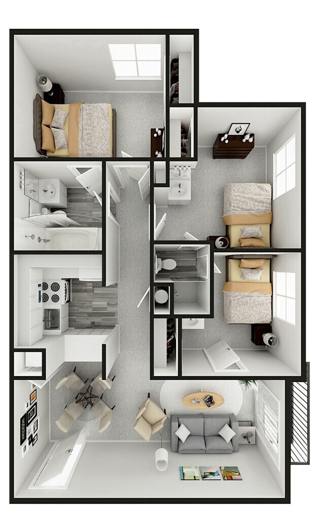 Apartment Model: 3 Bedroom A/B$8203 Bedroom, 2 Bath, 950 sq ftAvailable July 10, 2026![]()