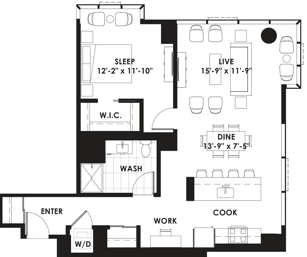 1A - Floorplan 2 Apartment Unit: 1203Apartment Model: 1A$2,3471 Bedroom, 1 Bath, 662 sq ftAvailable NowFloorplan 1E