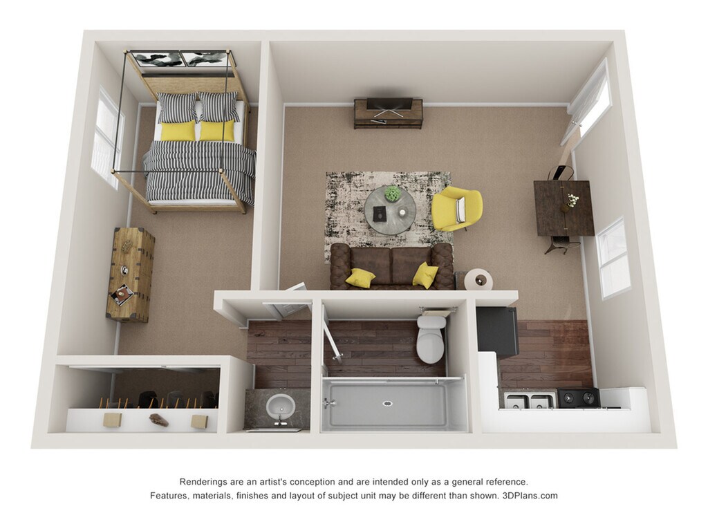 Studio Reno - Floorplan 1 Apartment Unit: G107Apartment Model: Studio Reno$715Studio, 1 Bath, 405 sq ftAvailable Now1 Bedroom