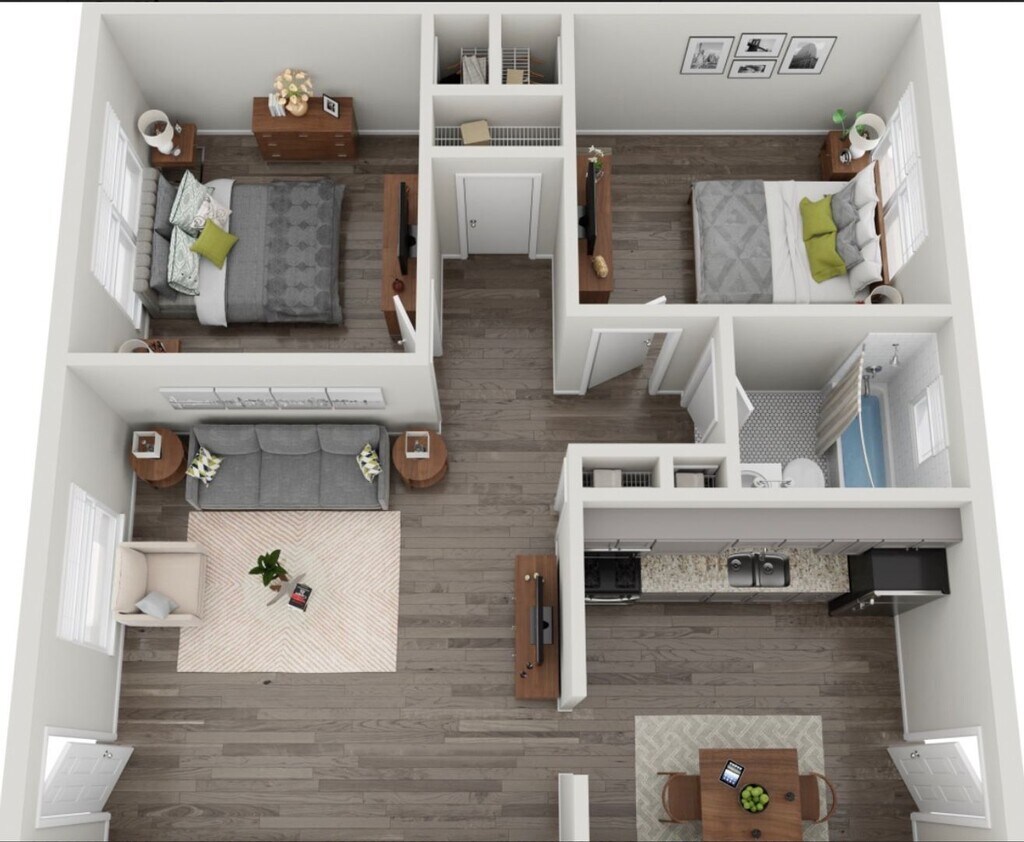 Apartment Model: 2 Bed 1 Bath | 850 sq ft - Premium W/D - 1st FloorFrom $1,2002 Bedroom, 1 Bath, 850 sq ftAvailable NowFloorplansPhotos![]()