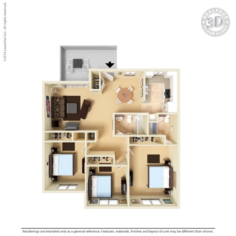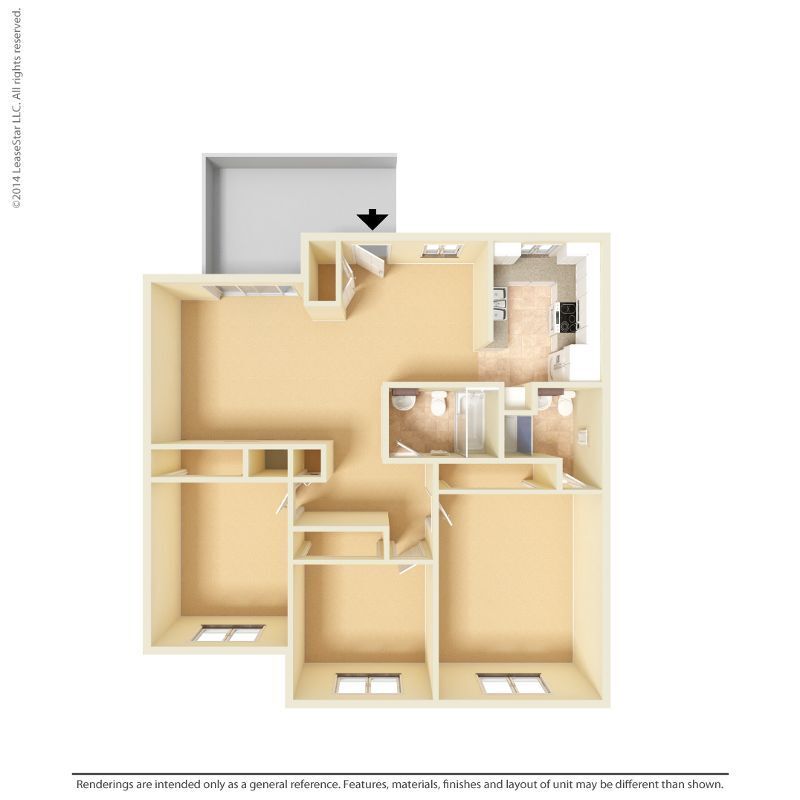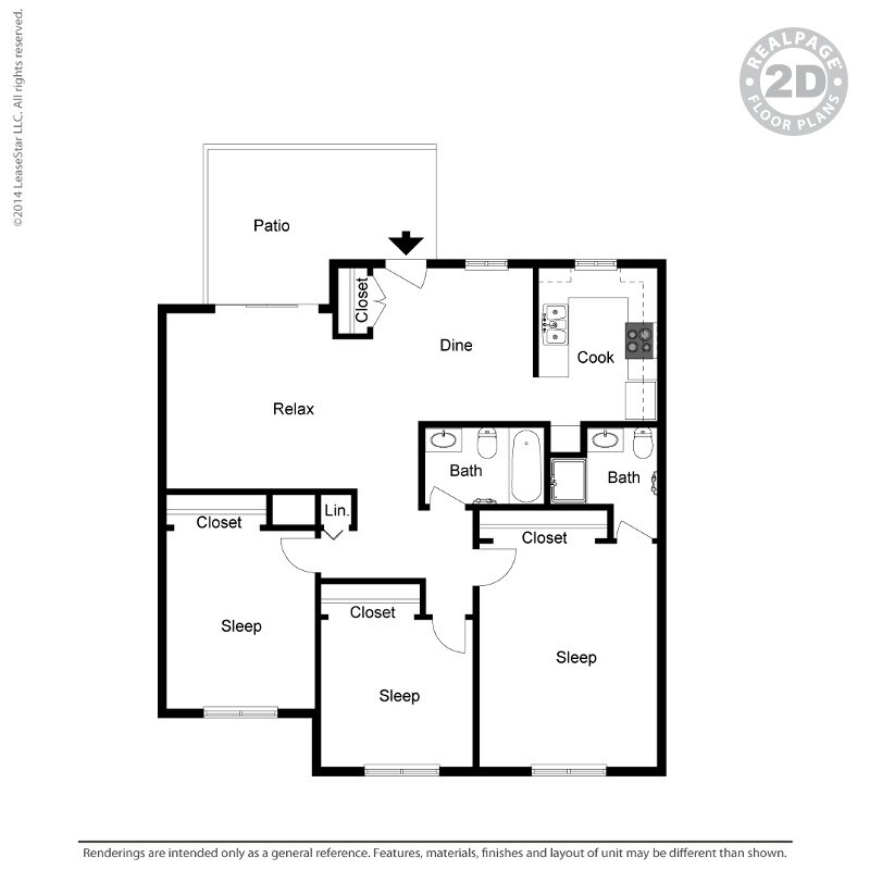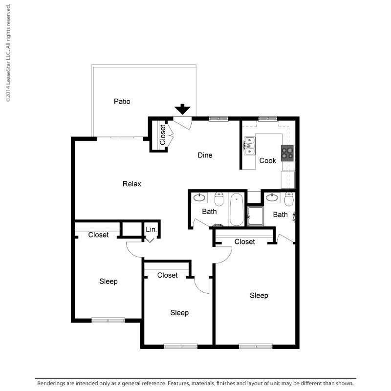 Apartment Model: Medium 3 Bed 1.75 Bath$2,9963 Bedroom, 2 Bath, 1100 sq ftAvailable NowFloor plans are artist's rendering. All dimensions are approximate. Actual product and specifications may vary in dimension or detail. Not all features are available in every rental home. Prices and availability are subject to change. Base rent is based on monthly frequency. Additional fees may apply, such as but not limited to package delivery, trash, water, amenities, etc. Deposits vary. Please see a representative for details.