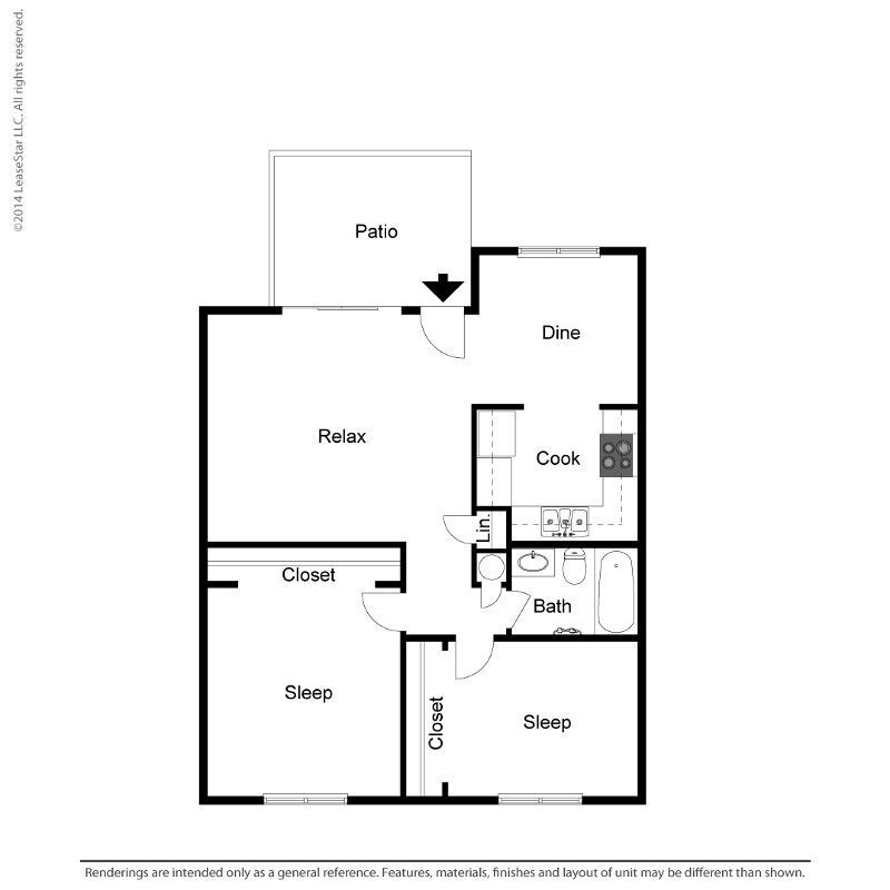 Large 2 Bed 1 Bath - Floorplan 3 Floor plans are artist's rendering. All dimensions are approximate. Actual product and specifications may vary in dimension or detail. Not all features are available in every rental home. Prices and availability are subject to change. Base rent is based on monthly frequency. Additional fees may apply, such as but not limited to package delivery, trash, water, amenities, etc. Deposits vary. Please see a representative for details.