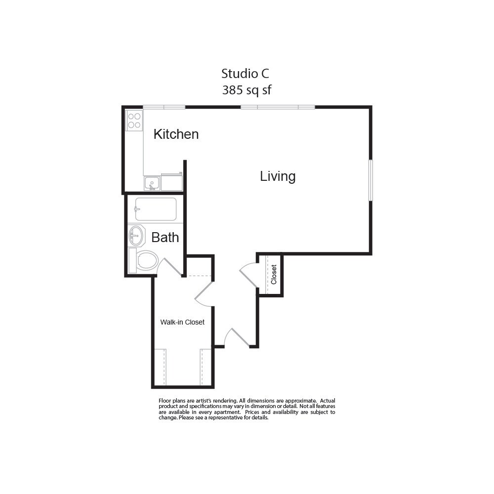 Availability Date Unit Sq Ft Unavailable Studio C 385 sq ft Apartment Model: Studio CStudio, 1 Bath, 385 sq ftUnavailableFloor plans are artist's rendering. All dimensions are approximate. Actual product and specifications may vary in dimension or detail. Not all features are available in every rental home. Prices and availability are subject to change. Base rent is based on monthly frequency. Additional fees may apply, such as but not limited to package delivery, trash, water, amenities, etc. Deposits vary. Please see a representative for details.