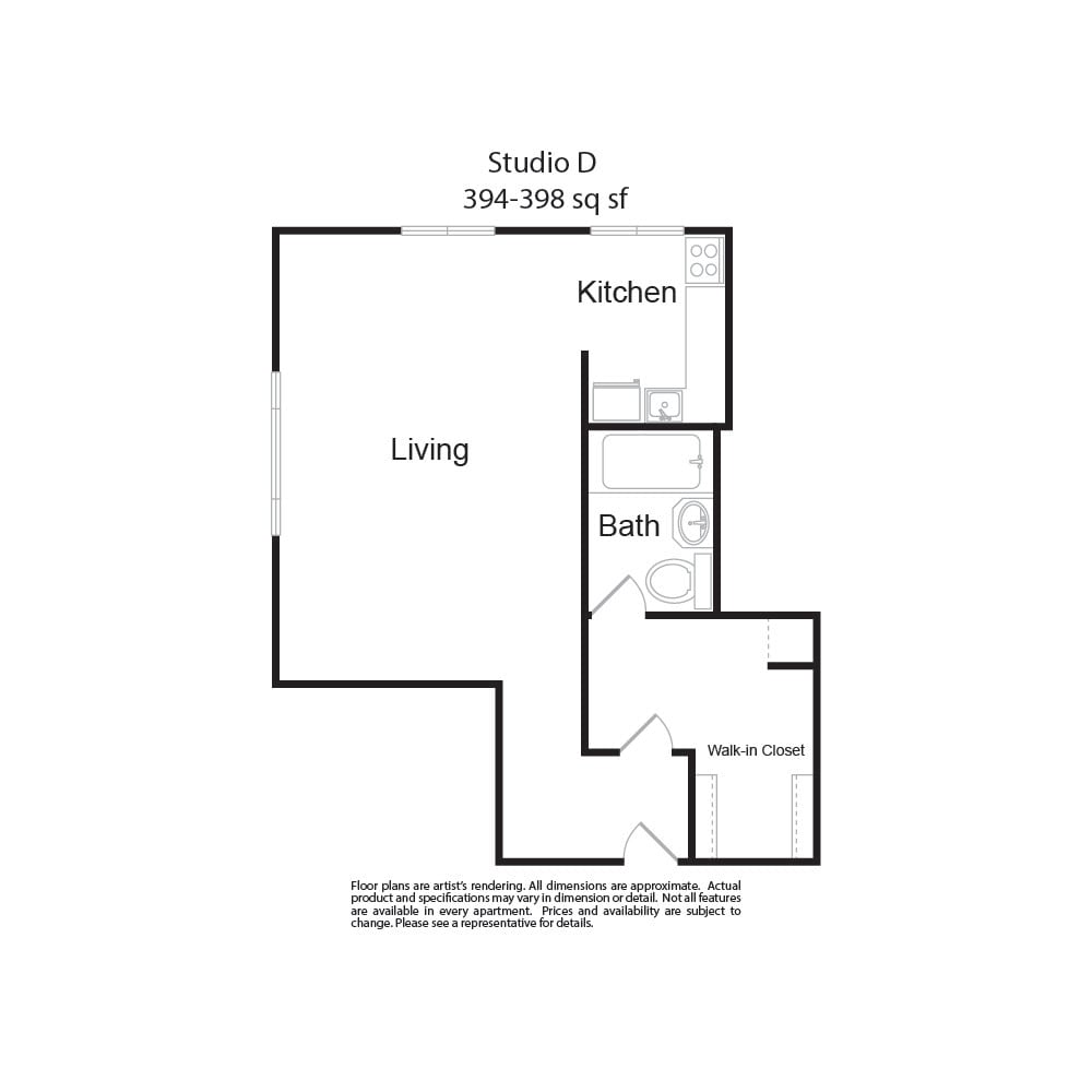 Availability Date Unit Sq Ft Unavailable Studio D 394 sq ft Apartment Model: Studio DStudio, 1 Bath, 394 sq ftUnavailableFloor plans are artist's rendering. All dimensions are approximate. Actual product and specifications may vary in dimension or detail. Not all features are available in every rental home. Prices and availability are subject to change. Base rent is based on monthly frequency. Additional fees may apply, such as but not limited to package delivery, trash, water, amenities, etc. Deposits vary. Please see a representative for details.