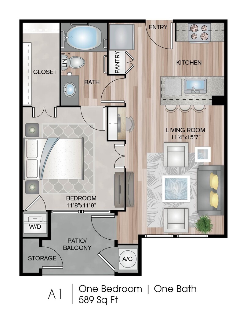 Apartment Model: A1From $1,1751 Bedroom, 1 Bath, 589 sq ftAvailable Now![]()