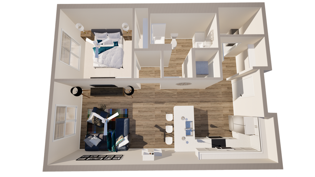 The Ellis floor plan offers 580 square feet of efficient, stylish living in a smart studio-style layout. This layout blends the best of open-concept design with a touch of separation. The modern kitchen includes a full island, while the living area is bright and inviting—perfect for relaxing or entertaining. With a spacious bathroom, in-unit laundry, and sleek finishes throughout, the Ellis makes the most of every square foot. It’s a perfect fit for those who want low-maintenance living with high-end style in the heart of the NewBo District.