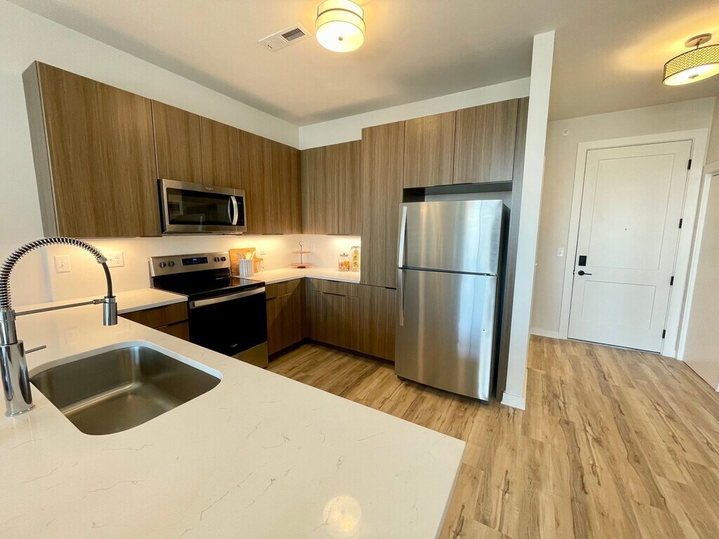 Find the perfect apartment home at Loomis Crossing! Nestled in the heart of Greenfield, the apartments offer a harmonious blend of comfort, convenience, and style. Step into a world of modern living with spacious 1- and 2-bedroom floor plans, large balconies, walk-in closets, and in-home washer and dryer. Elegant kitchens feature quartz countertops and quartz backsplash, stainless steel appliances, designer pendant lighting and eat-in kitchen islands. The apartments offer tall 10-foot ceilings, floor to ceiling windows with roller shades, and hard plank flooring in main living areas. Community amenities include: indoor parking, fitness center, resident club room, and community patio with grilling area and fire tables. Got pets? Loomis Crossing features a pet washing station and large dog exercise area!