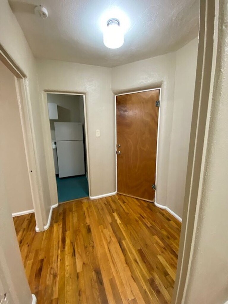 Updated with new bathroom, nice wood floors, retro kitchen. Walking distance to downtown. Off street parking. Rent includes water, sewer, gas, and trash service. Tenant pays electric. On site laundry. Storage units available on site. No smoking of any kind. $55 application fee.