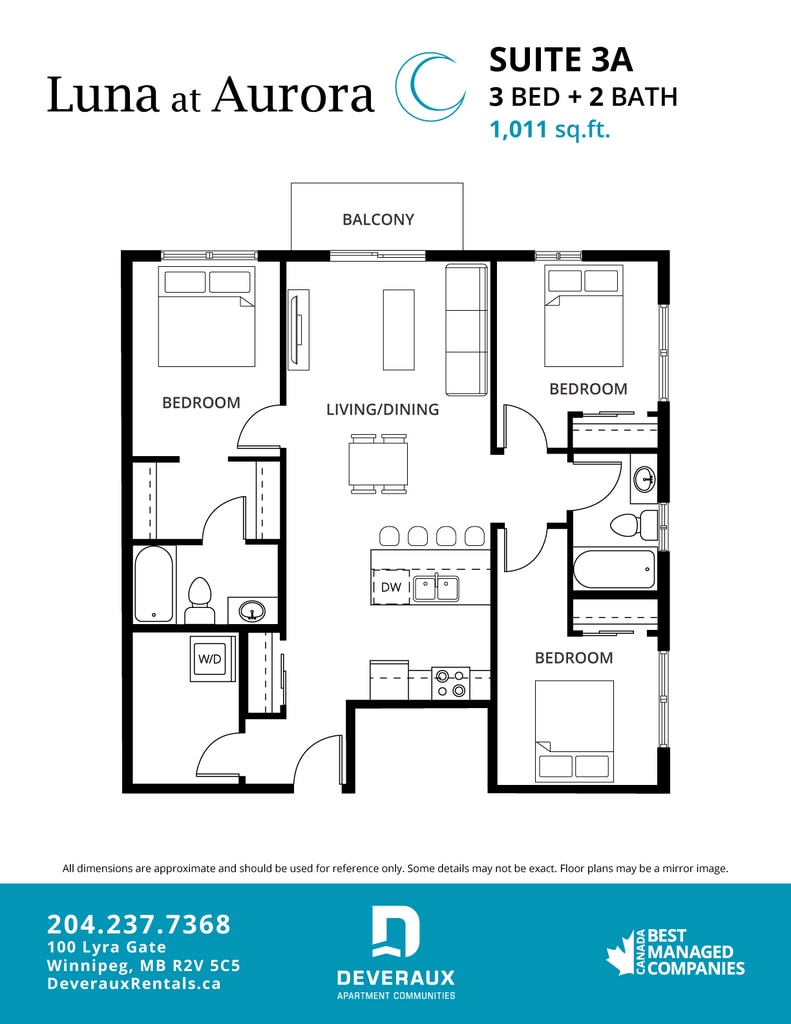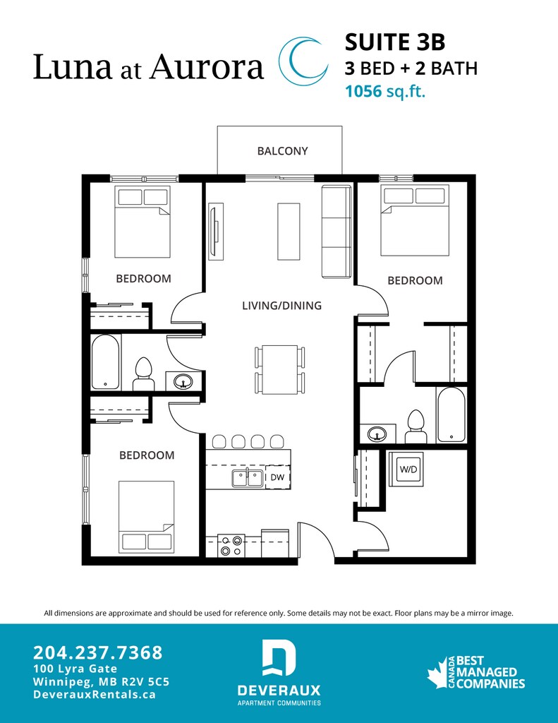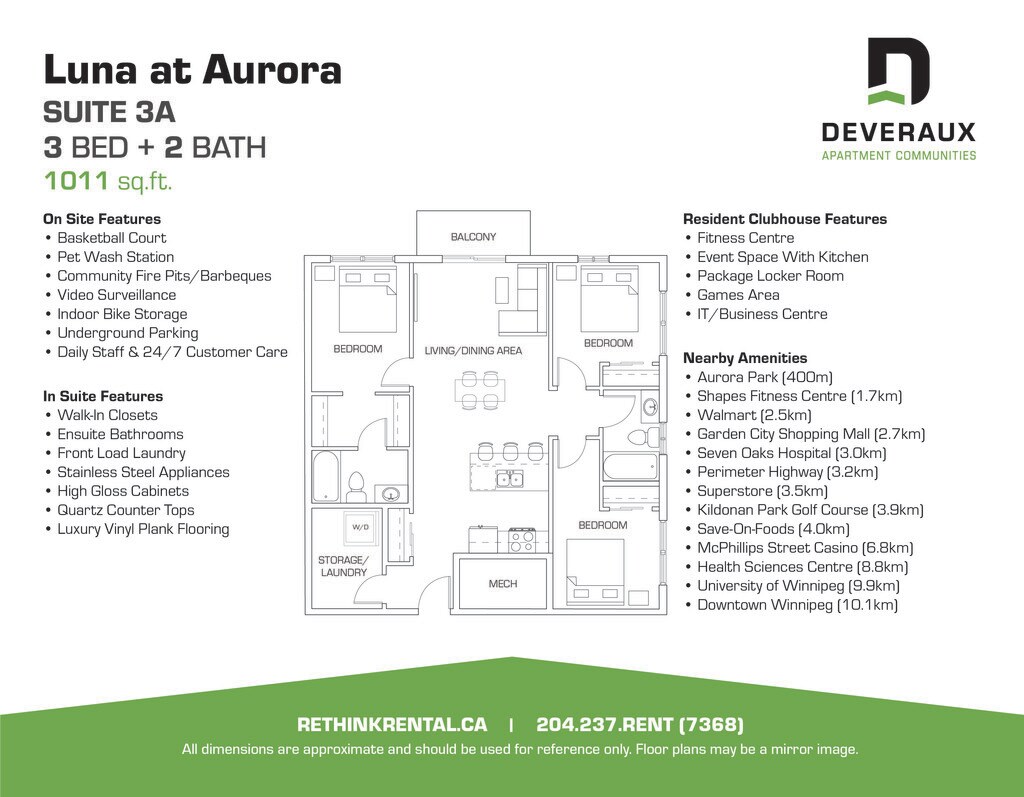 Luna at Aurora is a pet-friendly community that offers one, two and three bedroom apartments for rent in Aurora at Northpoint, a growing neighbourhood in north Winnipeg.Suites are fully equipped with central heat, air conditioning, full-size stainless-steel appliances (including dishwasher and microwave), in-suite laundry and modern finishes such as quartz countertops and luxury vinyl plank flooring.Rent includes water, in-suite laundry and exclusive access to a resident clubhouse.* Same-day application approvals are available.* Rates are based on a one-year lease and may vary by floor/layout.* Reduced security deposit for seniors.* Pet restrictions apply.