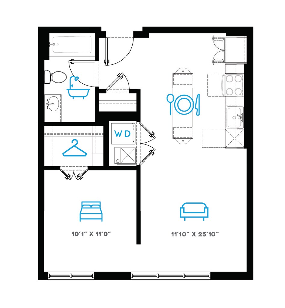 S2 - Floorplan Apartment Unit: 418SApartment Model: S2$2,132Studio, 1 Bath, 555 sq ftAvailable April 8, 20271 Bedroom