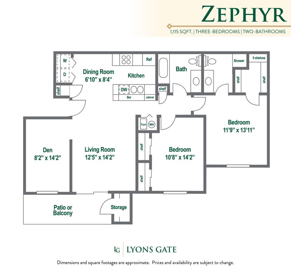 Lyons Gate Apartments offers 1 to 3 Bedroom apartments starting from $891 and having 569–1,144 sq ft. Here is the current pricing and availability: