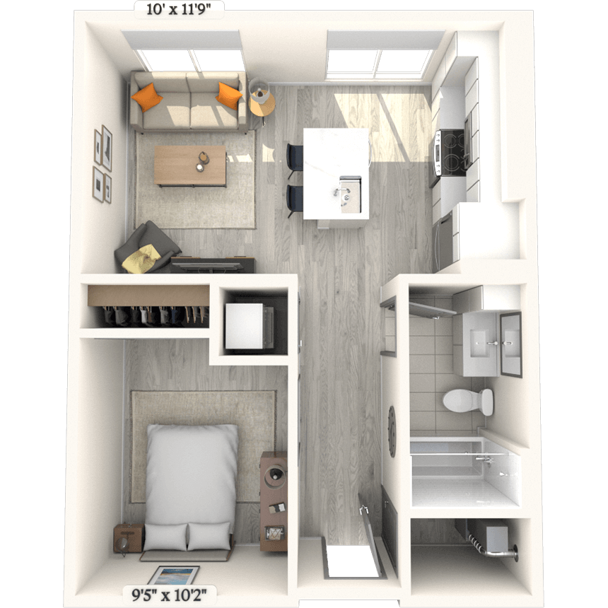 Apartment Model: Studio E1 0x1 588 SFFrom $1,718Studio, 1 Bath, 588 sq ftAvailable Now![]()
