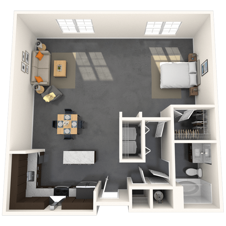 Apartment Model: Loft 0x1 713-1080 SFFrom $1,450Studio, 1 Bath, 713-1059 sq ftAvailable Now![]()