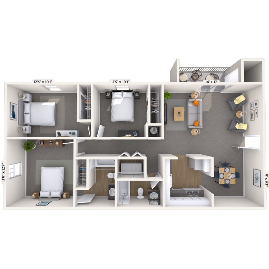 3 Beds, 2 Baths, 1150 sq ftAvailable Apr 12Model Gallery