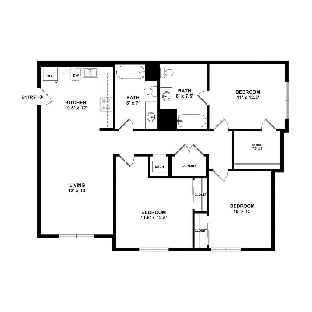 2 Bedroom 1 Bath A - Floorplan 3 3 Bedrooms