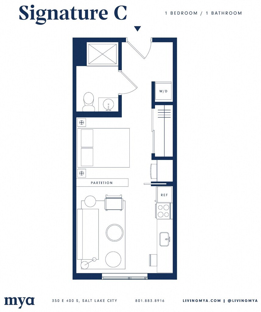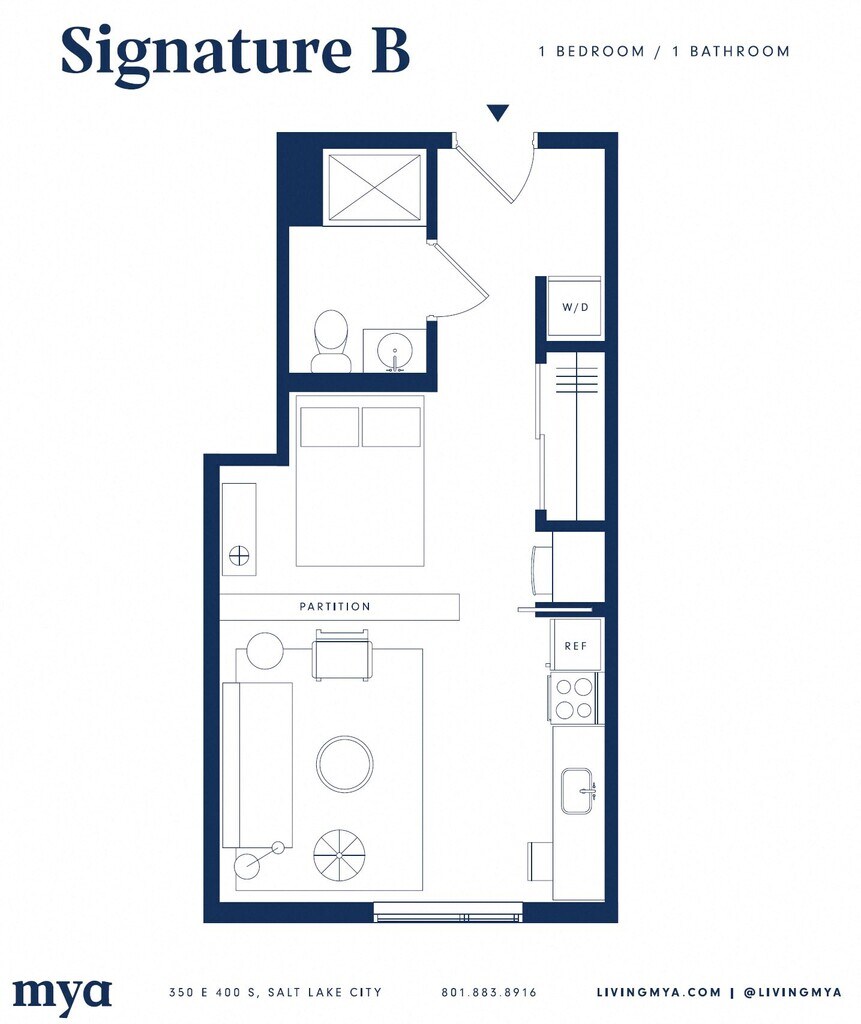 A new adventure in Salt Lake City living, Mya features thoughtfully-designed residences that maximize style and efficiency. Myas apartments are ready for you, offering a flexible layout equipped with a full kitchen, ample storage, and separate living and sleeping space. With a focus on community and lifestyle that extends from the apartments to the airy lobby, resident lounge, and fitness center, Mya is for those whose life is here and there and everywhere. Mya is home.
