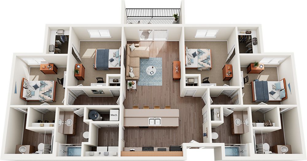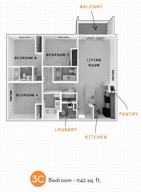 C2 - Floorplan 2 Apartment Unit: PrivateApartment Model: C23 Bedroom, 3 Bath, 1142 sq ftAvailable NowApartment Unit: PrivateApartment Model: C23 Bedroom, 3 Bath, 1142 sq ftAvailable August 13, 20264 Bedrooms