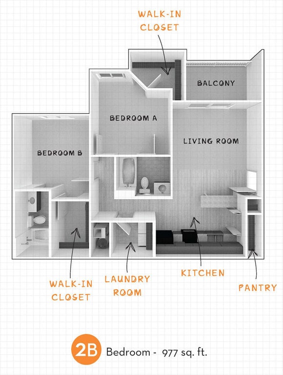 B1 - Floorplan 2 Apartment Unit: PrivateApartment Model: B12 Bedroom, 2 Bath, 977 sq ftAvailable NowApartment Unit: PrivateApartment Model: B12 Bedroom, 2 Bath, 977 sq ftAvailable August 13, 2026Floorplan B2