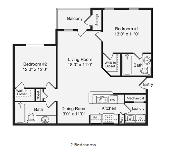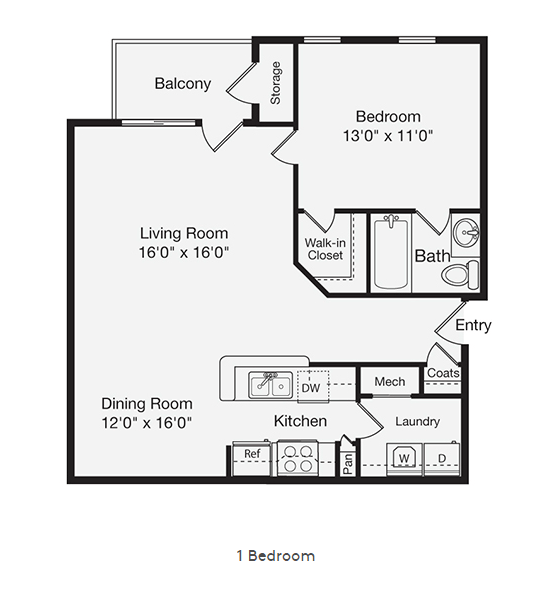 1 BD 1 BA Market - Floorplan 1 2 Bedrooms